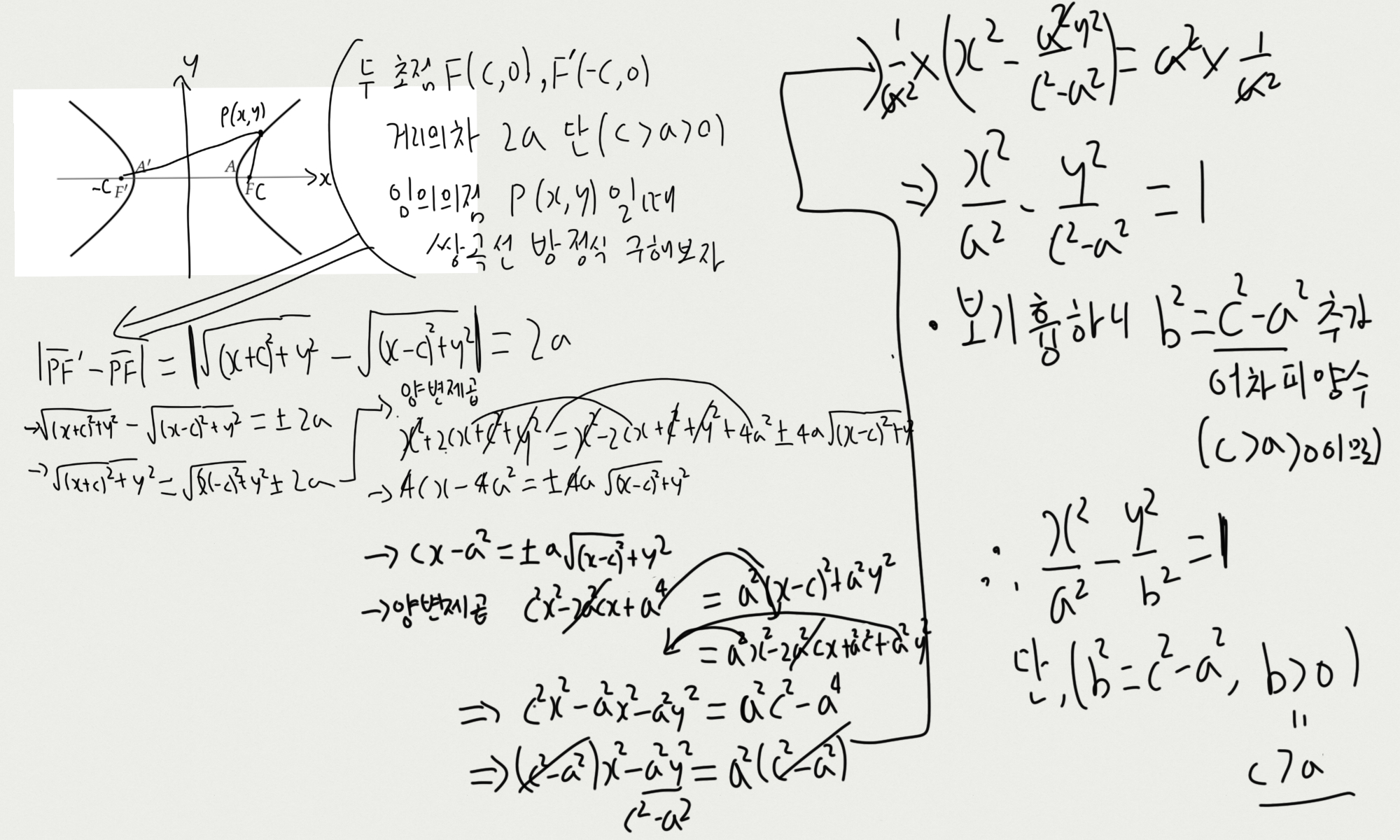 - 쌍곡선 함수의 두 초점 F(c, 0), F'(-c, 0), 두 초점과의 차는 2a, 쌍곡선 함수의 임의의 점 P(x, y)라고 할 때, 쌍곡선 방정식을 그려보자.