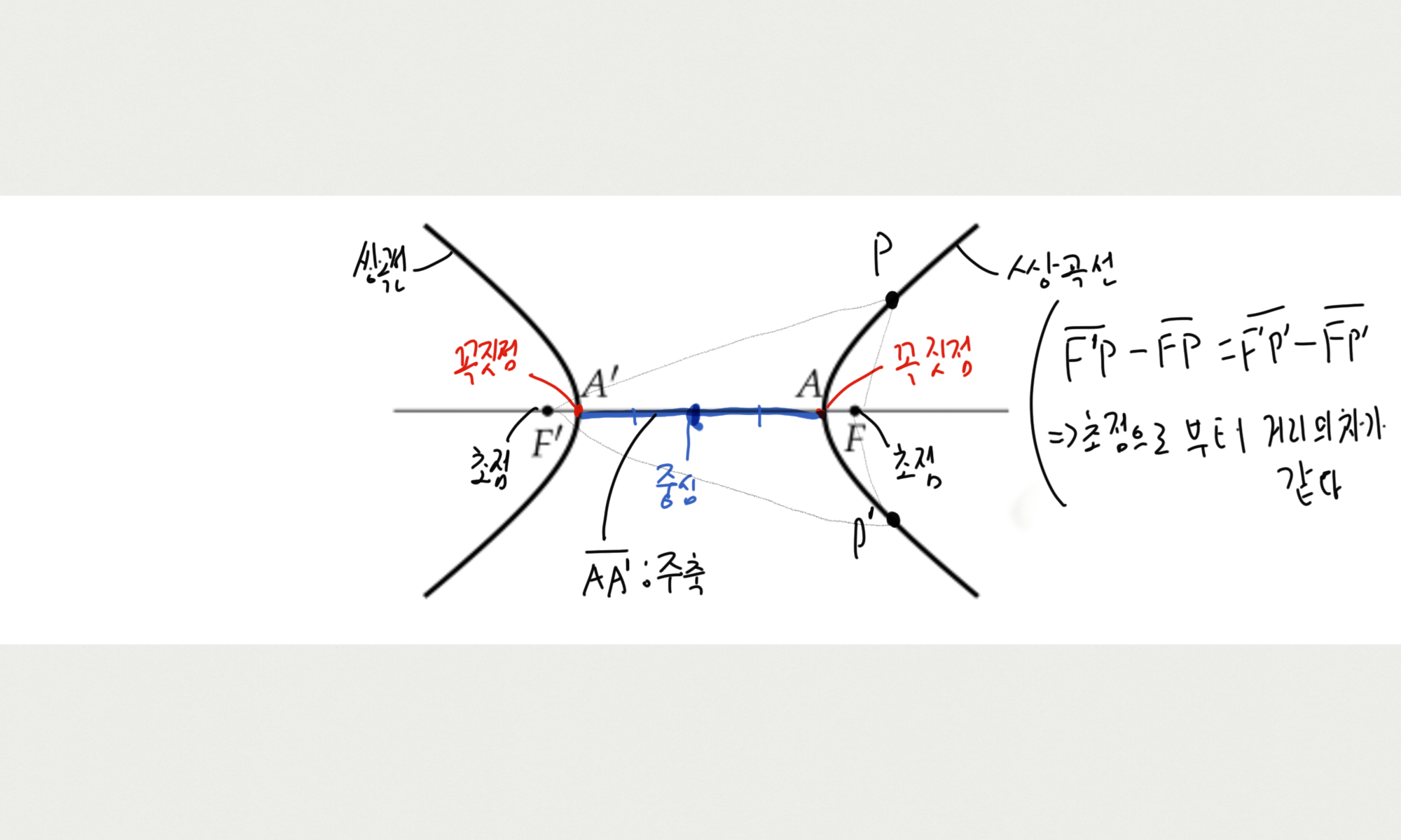 - 쌍곡선 : 평면 위의 서로 다른 두 점 F, F'으로부터의 거리의 차가 일정한 점들의 집합을 "쌍곡선"이라 한다.