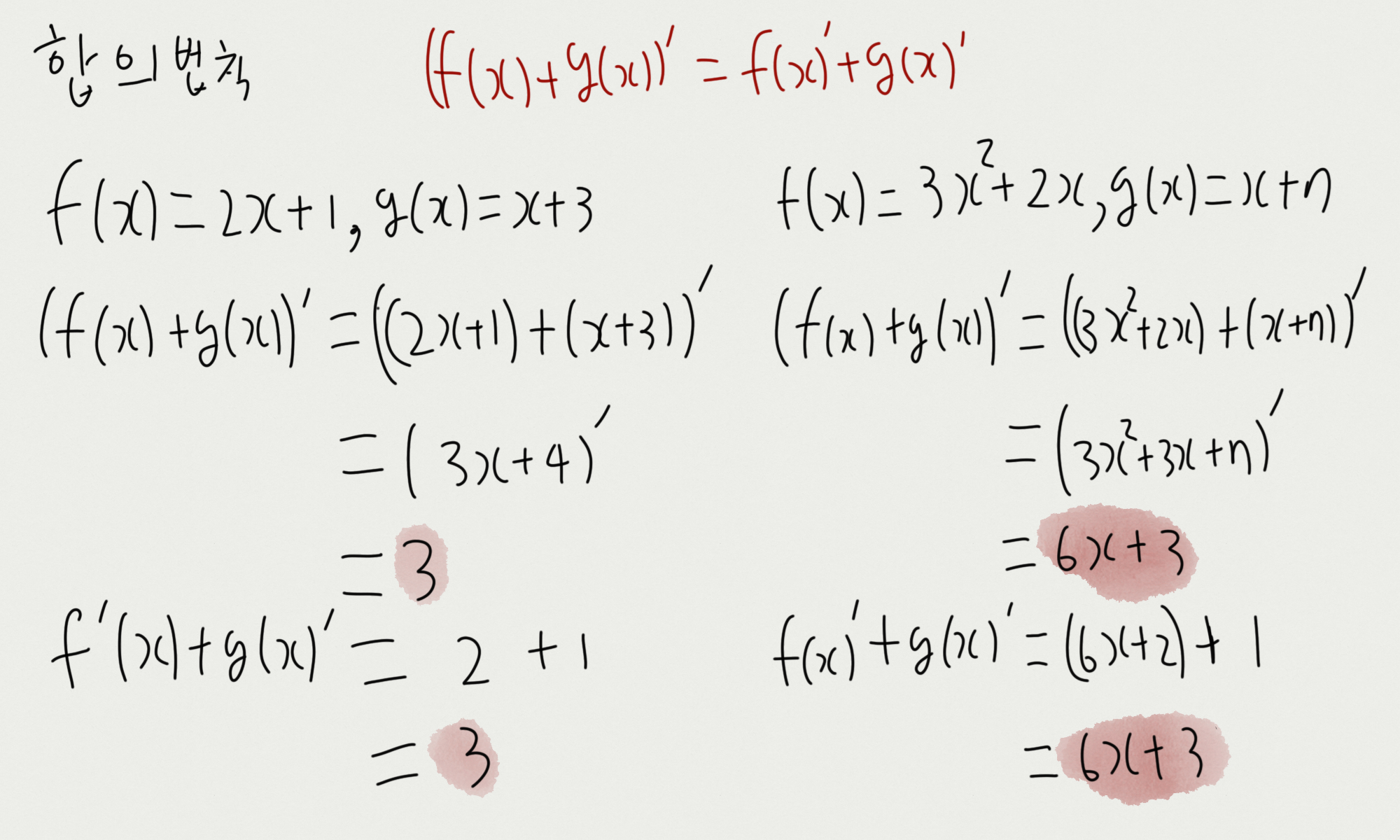 $$ 합의\ 법칙 \rightarrow (f(x) + g(x))'=f'(x)+g'(x) $$