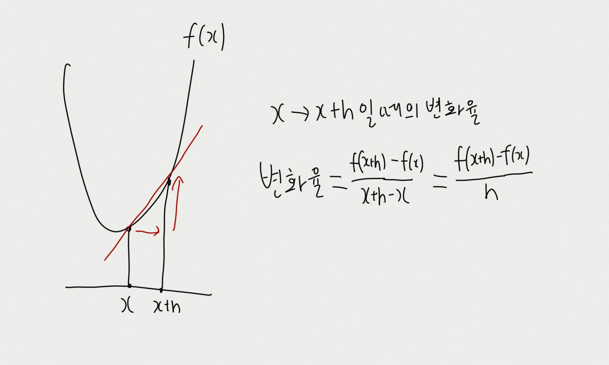 $$ 변화율 = \frac{f(x+h) - f(x)}{x + h - x} = \frac{f(x+h) - f(x)}{h}$$