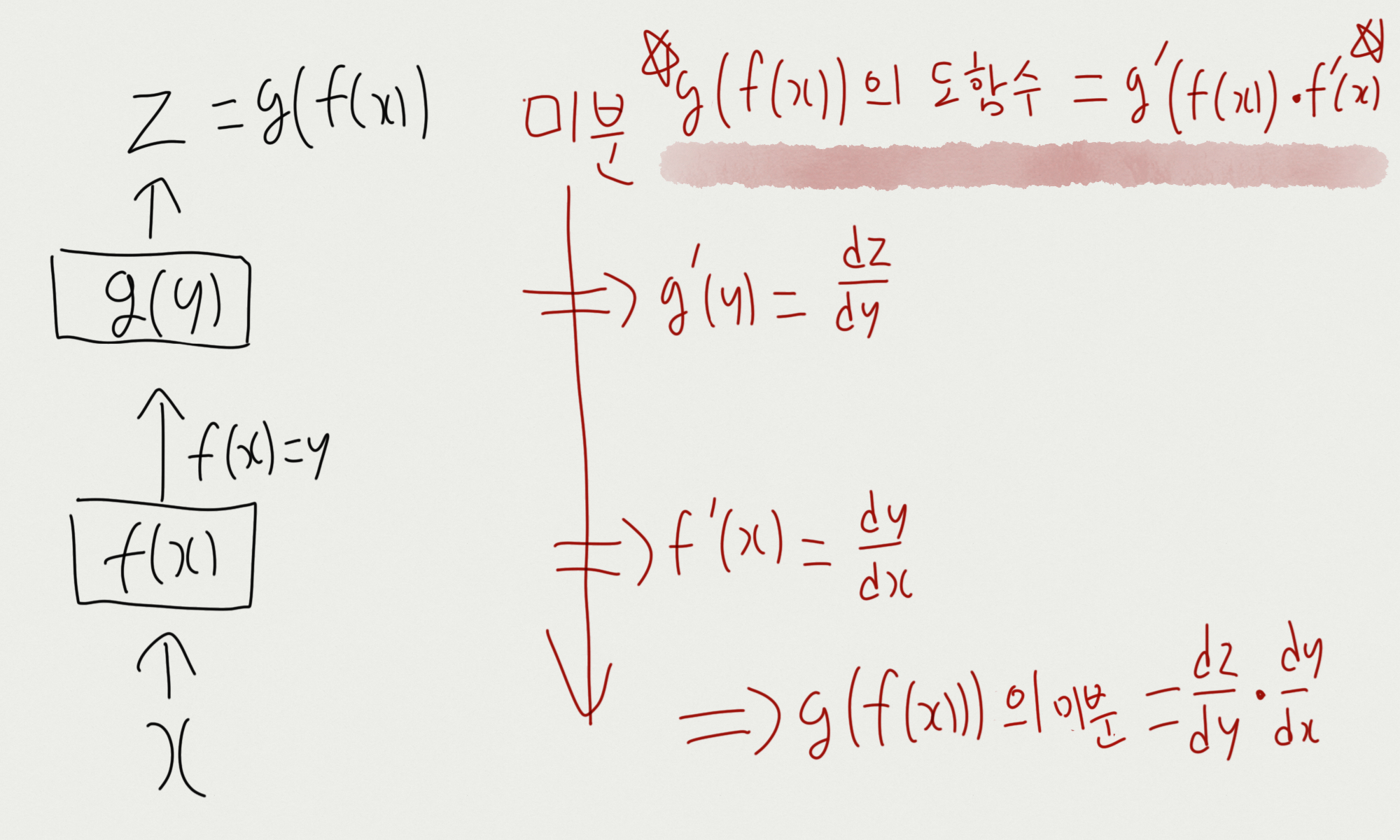 x라는 input 값이 f(x)와 g(x)라는 두 개의 함수를 걸쳐 z라는 output을 얻게 된다.