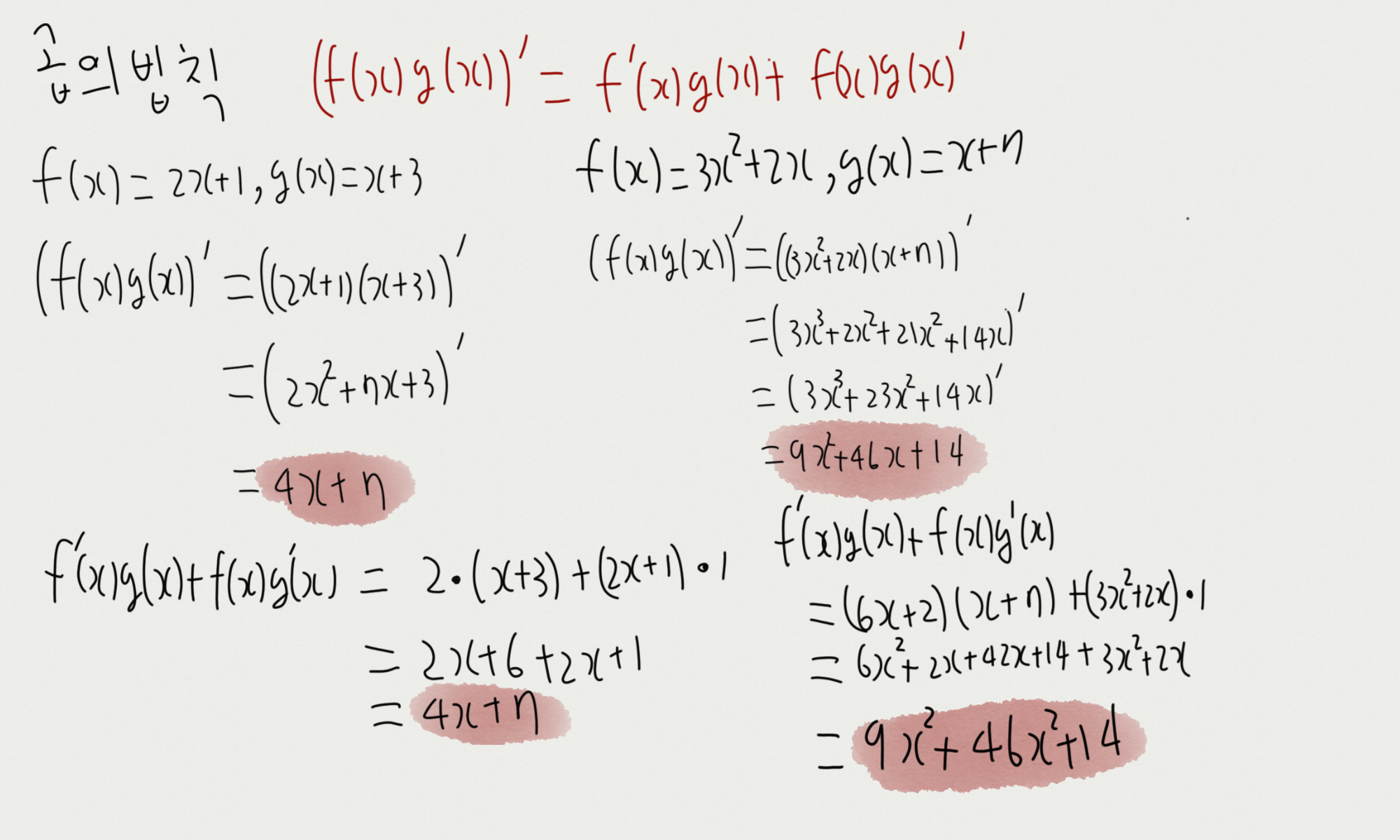 $$ 곱의\ 법칙 \rightarrow (f(x)g(x))'=f'(x)g(x)+f(x)g'(x) $$