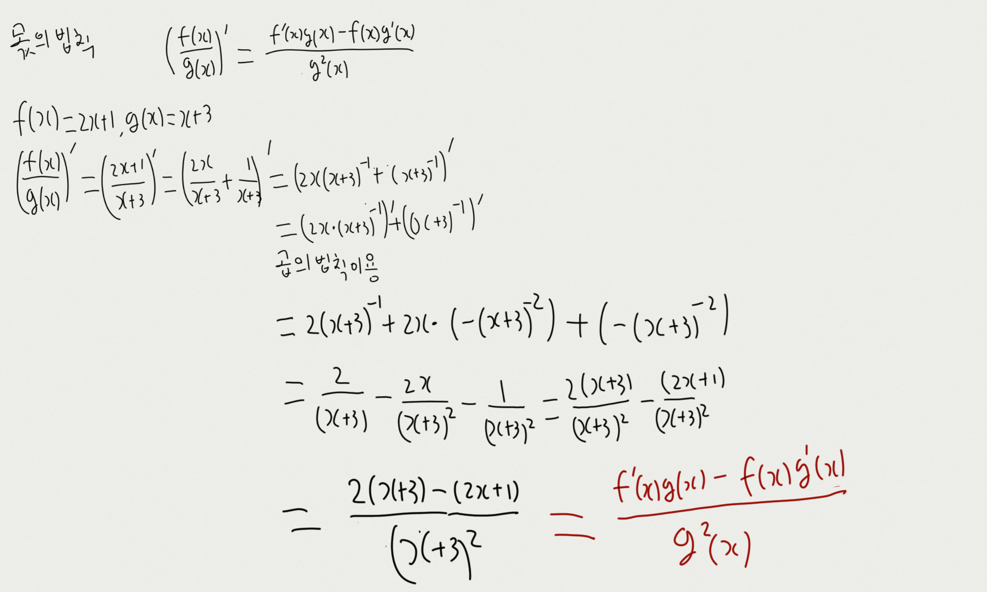 $$ 몫의\ 법칙 \rightarrow \left ( \frac{f(x)}{g(x)} \right)'=\frac{f'(x)g(x)-f(x)g'(x)}{g^{2}(x)} $$